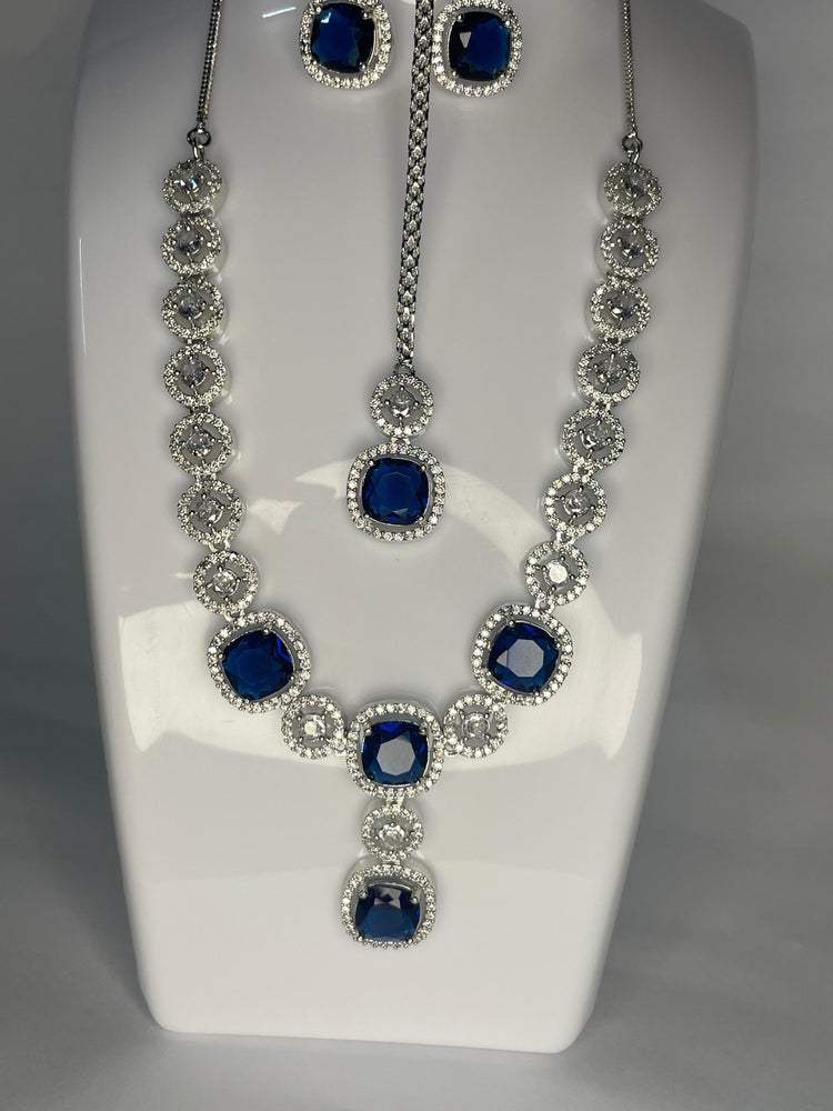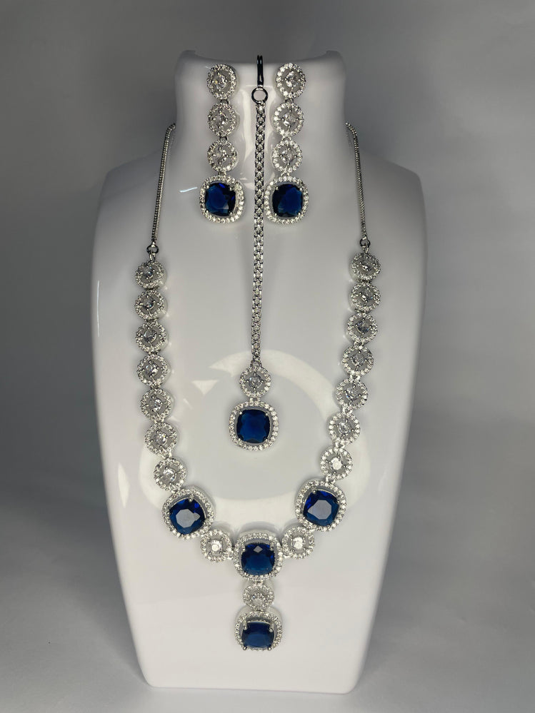 Shine in style with this elegant blue and silver American diamond set.